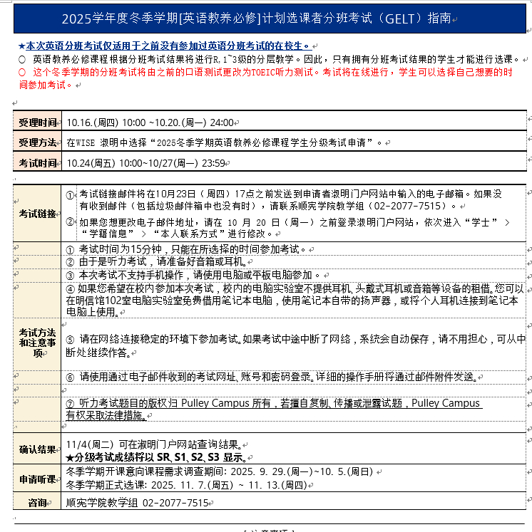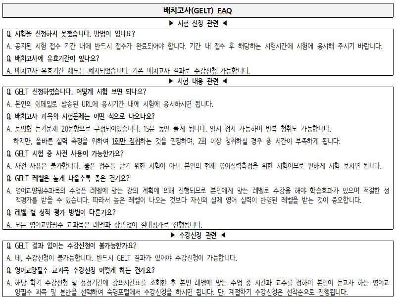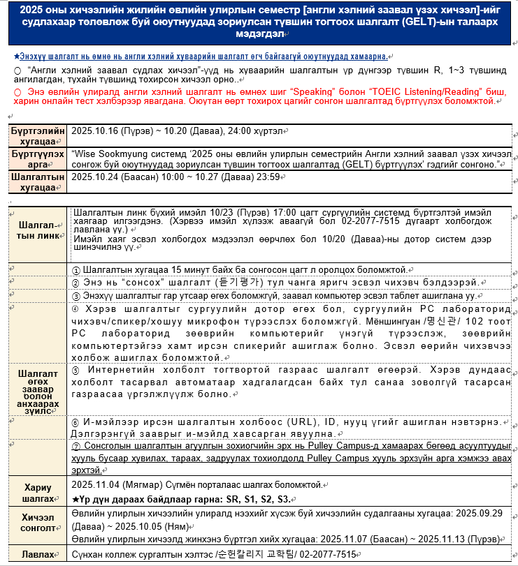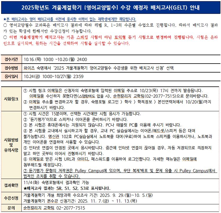 2025학년도 겨울계절학기 [영어교양필수] 수강 예정자 배치고사(GELT) 안내/ Notice on the Placement Test (GELT) for Students Planning to Take the Required English Liberal Arts Course in the 2025 Winter Session