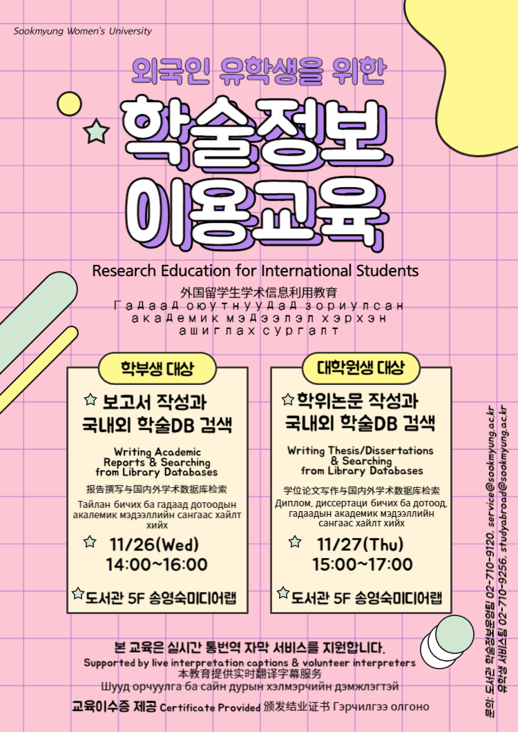 📚[비교과] 외국인 유학생을 위한 학술정보 이용교육 특강 안내 / [Extracurricular] Research Education for International Students / 外国留学生学术信息利用教育 / Гадаад оюутнуудад зориулсан судалгааны мэдээлэл хэрхэн ашиглах сургалт