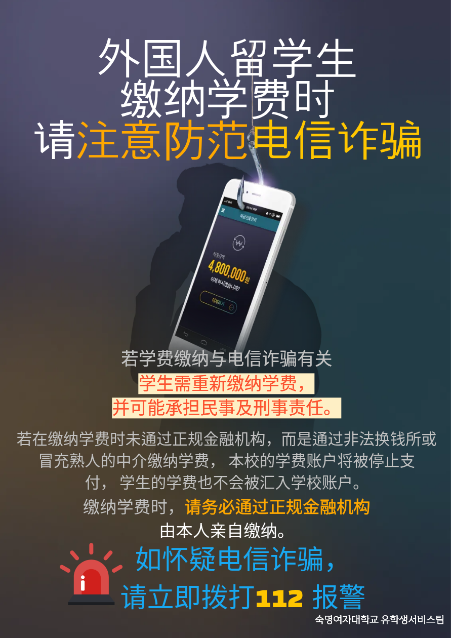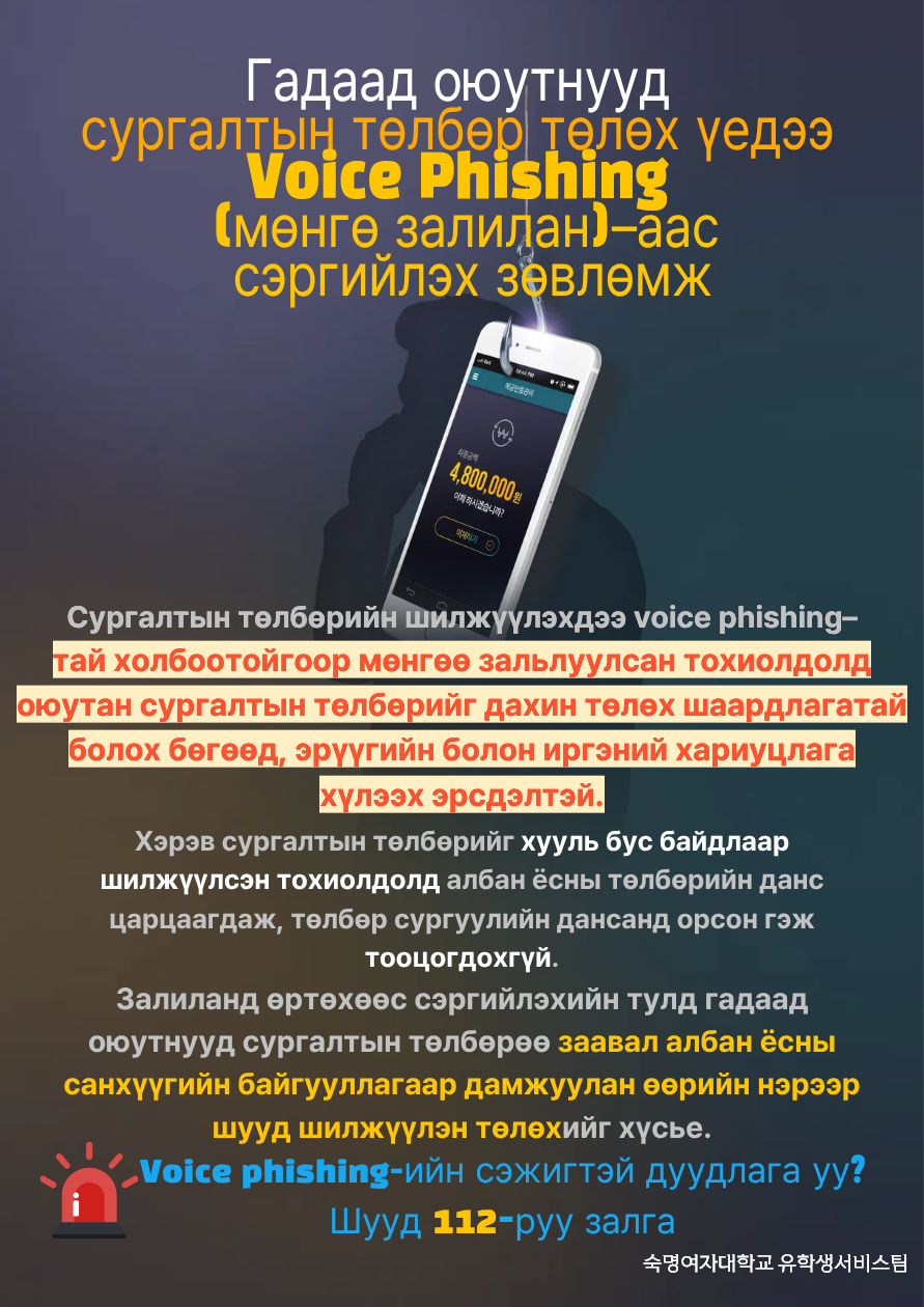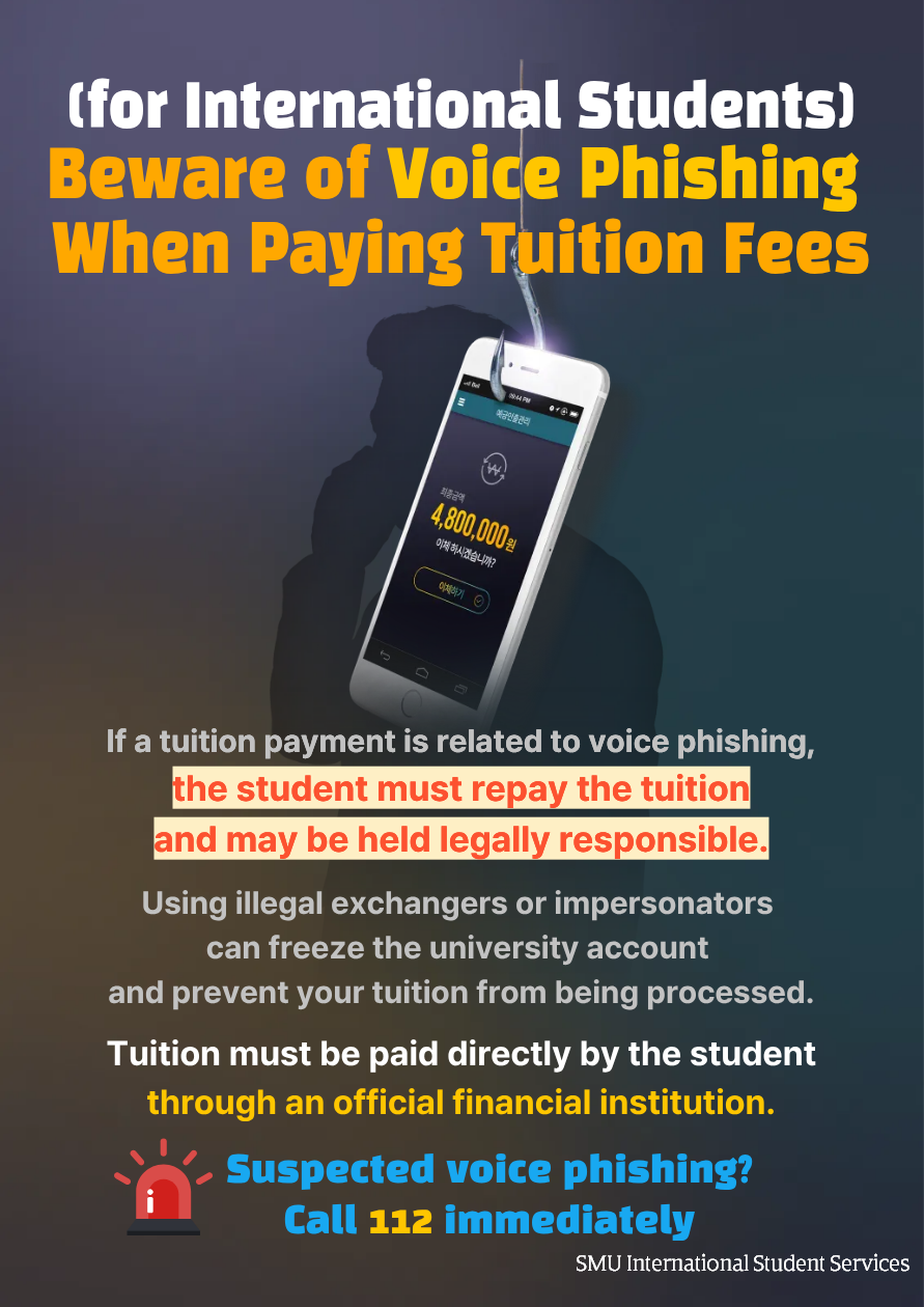 외국인유학생 등록금 납부 시 보이스피싱 주의/Beware of Voice Phishing When Paying Tuition Fees (for International Students)/外国人留学生缴纳学费时请注意防范电信诈骗/Сургалтын төлбөрөө төлөхдөө утасны залиланд өртөхөөс сэрэмжлээрэй