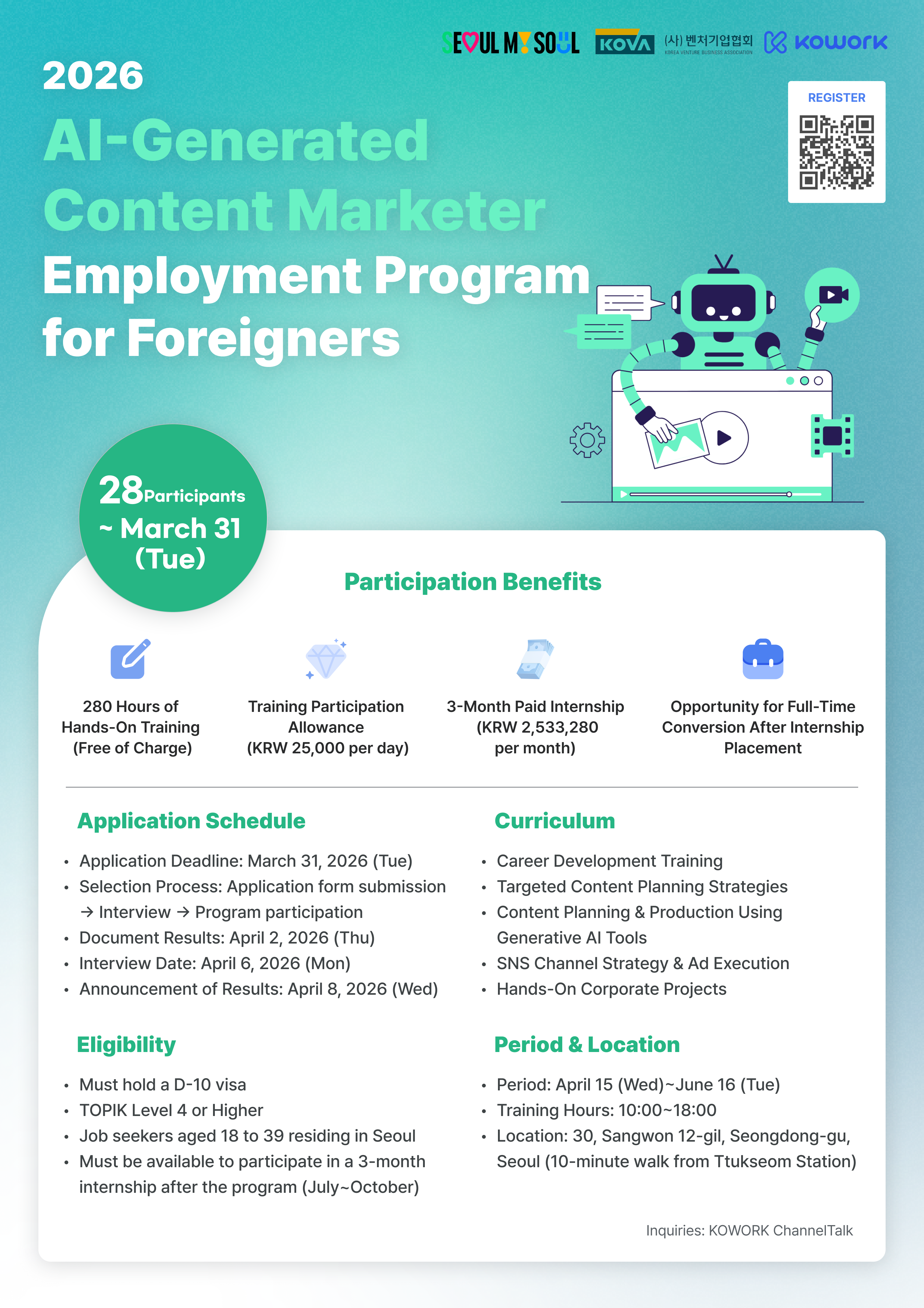 [코워크] ※서울시 지원 | 외국인 유학생 및 졸업생을 위한 무료 취업 연계 과정 / [Co-work] ※ Supported by the Seoul Metropolitan Government | Free job placement program for international students and graduates